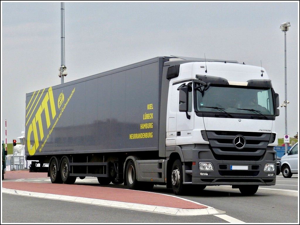 M-B Actros 3341 mit Hänger wird auf einer Fähre an Land gebracht, fotografiert in der Nähe von Neuharlingersiel. 09.05.2012