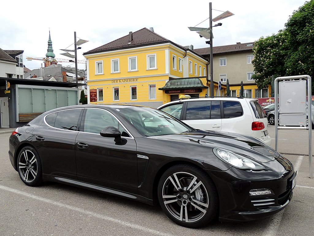 PORSCHE Panamera 4S wartet am Parkplatz, während sich der Fahrer kulinarisch im Kaiserhof zu Ried verwöhnen lässt; 120513