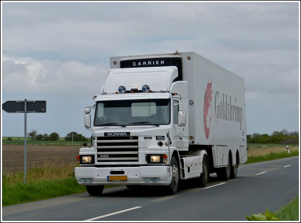 Scania 320 113 M Langschnauzer mit Kühlauflieger gesehen auf den Strassen in Ostfriesland am 11.05.2012.