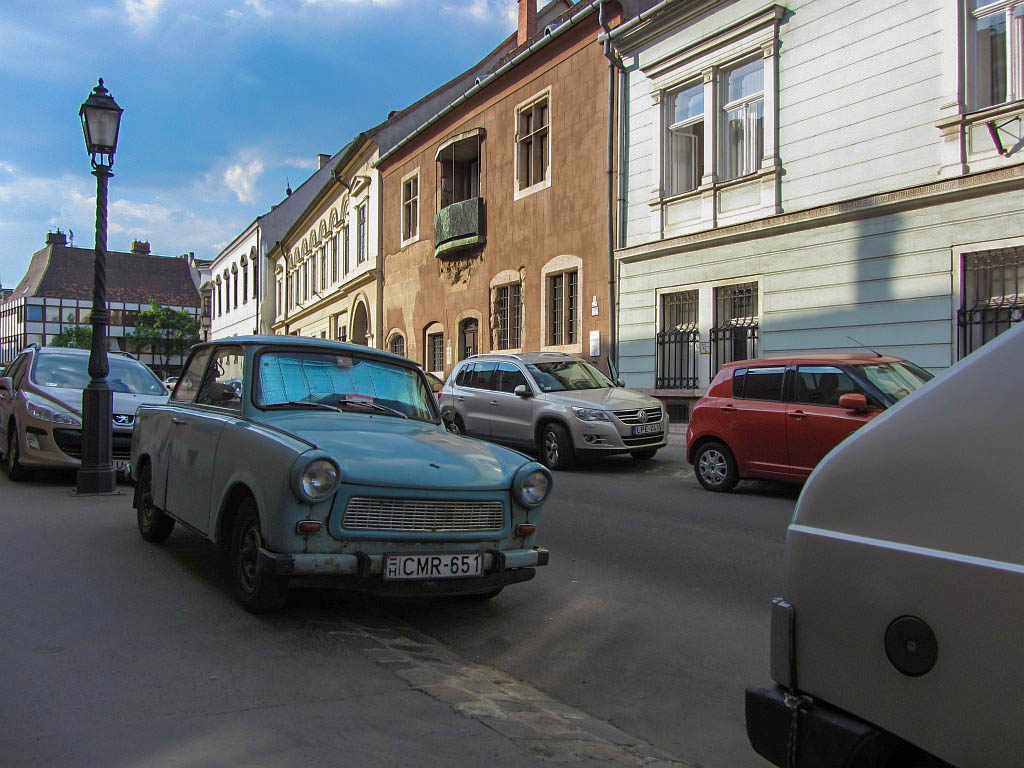 Trabant 601 zeigt hoher Kontrast neben neuer Peugeot und VW Tiguan -Budapest Burgviertel am 29.04.2012.