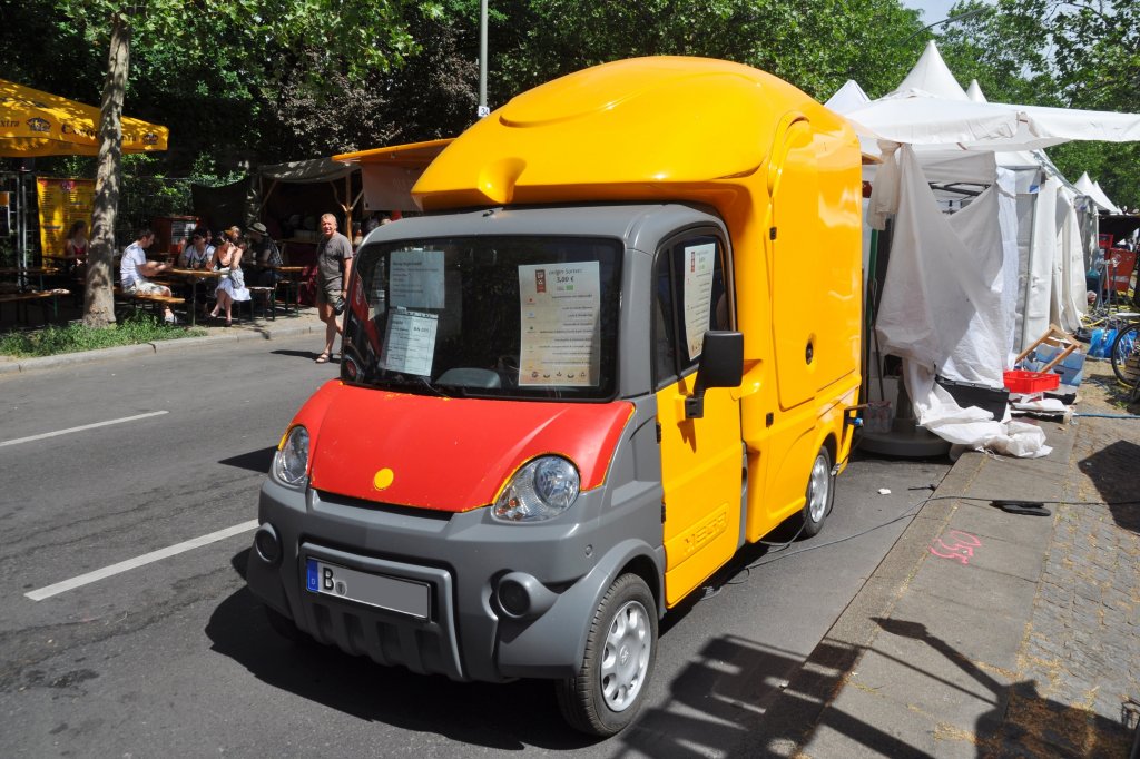 ein fahrender Verkaufsstand, gesehen auf dem Karneval der Kulturen (Berlin/Deutschland, 26.05.2012)