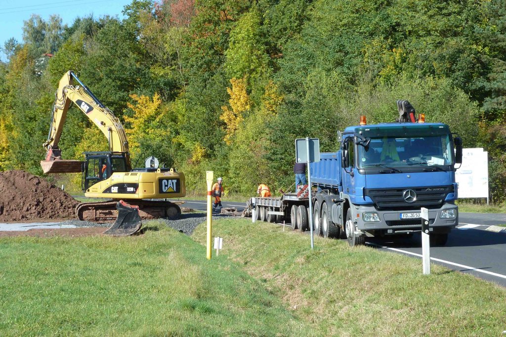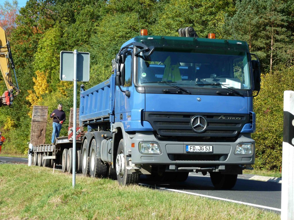Actros-Kipper mit Tieflader hat einen Bagger an die Laugenleitungsbaustelle in der Gemarkung von 36100 Petersberg-Marbach gebracht, Oktober 2012