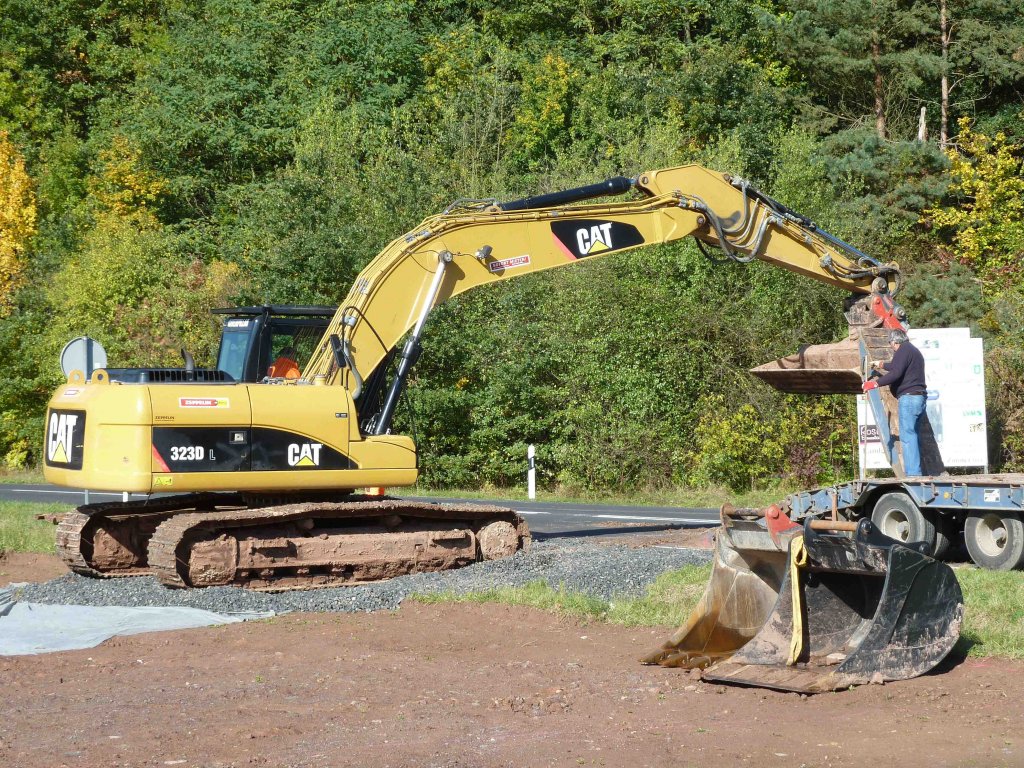CAT 323D wurde gerade an der Laugenleitungsbaustelle in der Gemarkung von 36100 Petersberg-Marbach abgeladen, Oktober 2012