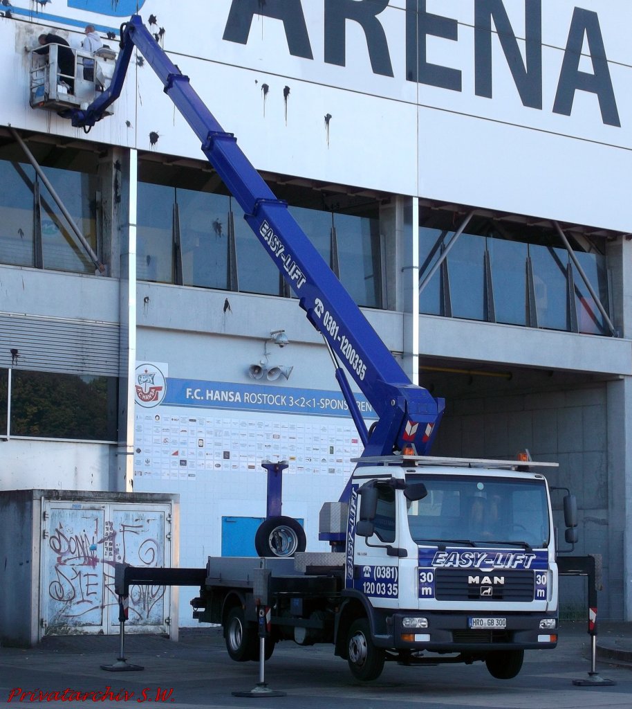 MAN TGL 7150 mit Hebebühne der Firma Easy-Lift,, Rostock 19.9.2012; Die Männer sind (mal wieder!!) mit der Beseitigung von Farbbeutel-Resten beschäftigt; Trotzdem der Name DKB-Arena nun schon seit 2007 besteht, gibt es noch so einige die "Ihr" OSTSEEstadion wiederwollen.