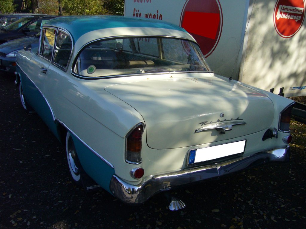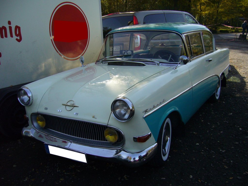 Opel Rekord P1. 1958 - 1960. Der P1 wurde 1957 auf der Frankfurter Automobilaus-stellung vorgestellt. Er war als zwei- oder viertürige Limousine und als CarAvan lieferbar. Desweiteren bauten die Karosseriewerke Autenrieth in Darmstadt den P1 auch auf Wunsch in ein Coupe oder Cabriolet um. Der P1 war wahlweise mit einem 1.5l Motor, der Anfangs 45 und später 50 leistete, oder einem 1.7l Motor mit 55 PS lieferbar. Besucherparkplatz der Historicar am 21.10.2012.
