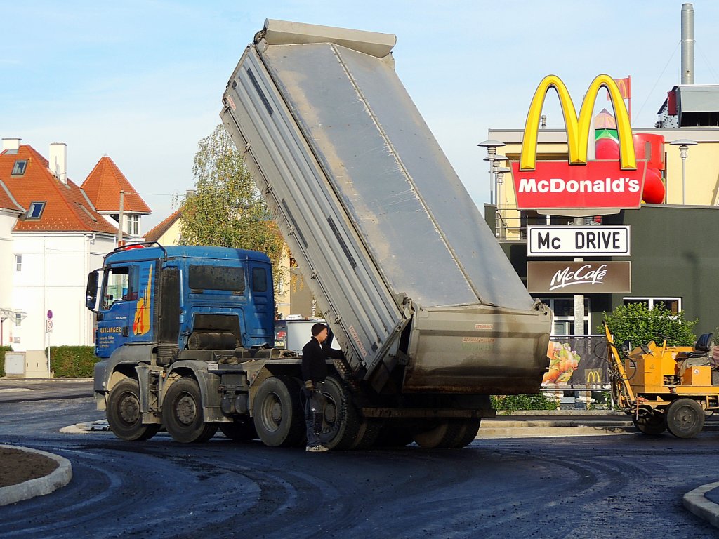 MAN TGS35.440 muß nach Entladung von heissem Asphalt wieder sorgfältig gereinigt werden; 121018