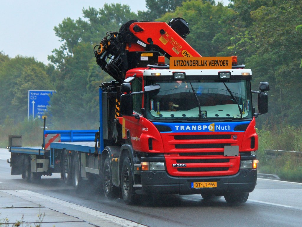 Mit überbreiter Ladung fährt dieser Volvo FH mit Pritschenauflieger am 11.09.2012 auf der A4 kurz vor der Niederländischen Grenze.