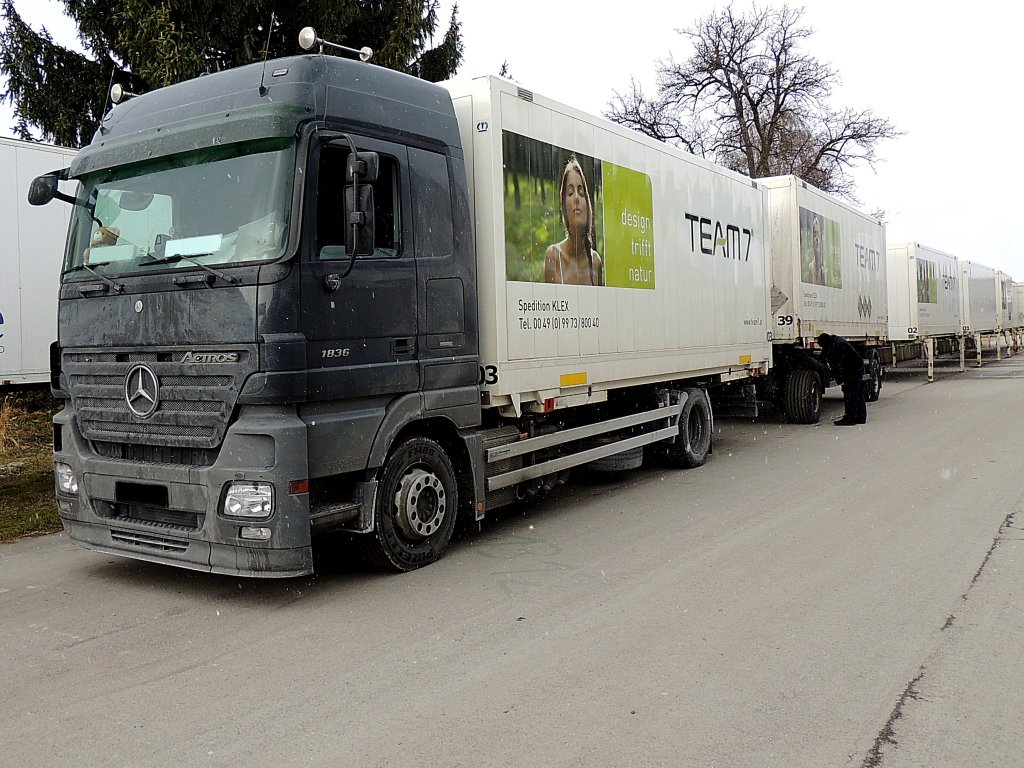 ACTROS-1836 holt bei einer Möbelerzeugungsfirma bereitgestellte Wechselaufbauten ab; 130315