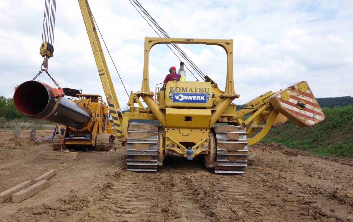Komatsu D 355 C bringt das gebogene Stahlrohr zum Lagerplatz beim Gasleitungsbau an der MIDAL-Trasse in 36100 Petersberg-Marbach, August 2013