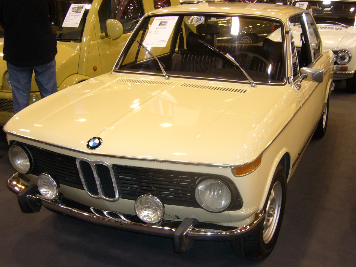 BMW 2002. 1968 - 1975. Hier wurde ein 2002 abgelichtet, der zwischen April 1971 und September 1973 produziert wurde, da er schon die seitlichen Gummizierleisten trägt, aber noch mit den runden Heckleuchten ausgestattet ist. Der 4-Zylinderreihenmotor leistet 100 PS aus 1.990 cm³ Hubraum. Der Wagen soll aus griechischen Erstbesitz stammen. Essen Motorshow am 05.12.2013.