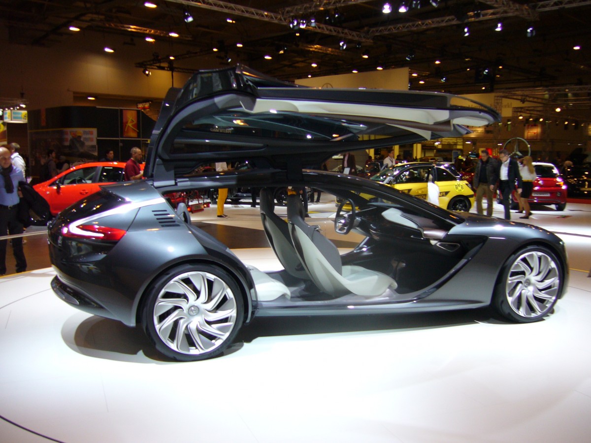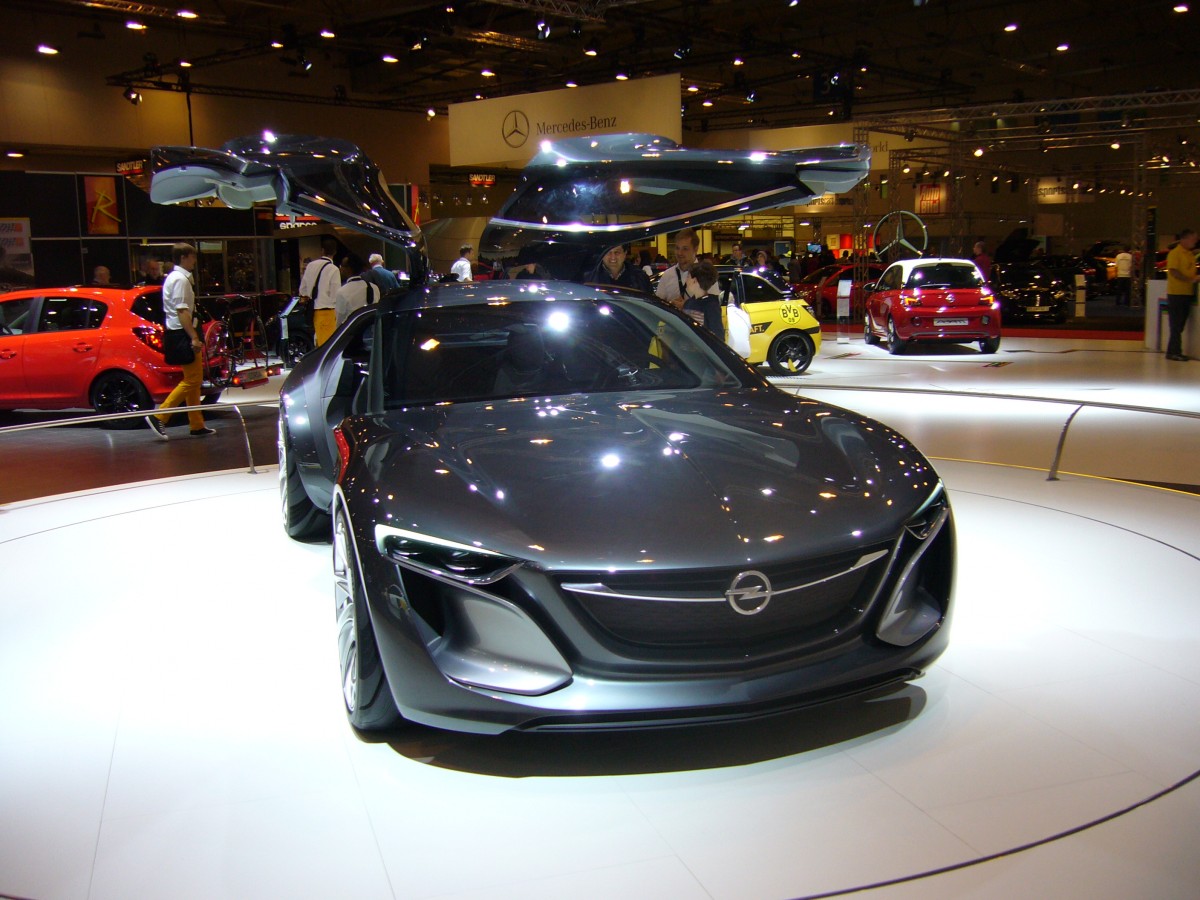 Opel Monza Concept. Dieses Conceptcar stellte Opel auf der diesjährigen IAA in Frankfurt/Main vor. Angetrieben wird dieses schicke Coupe von einem Elektromotor, der bei längeren Fahrten von einem 1.0l CNG-betriebenen 3-Zylinderreihenmotor ergänzt werden kann. Dieser CNG-motor (Compressed Natural Gas)kann auch für den Opel Adam geordert werden. Essen Motorshow am 05.12.2013.