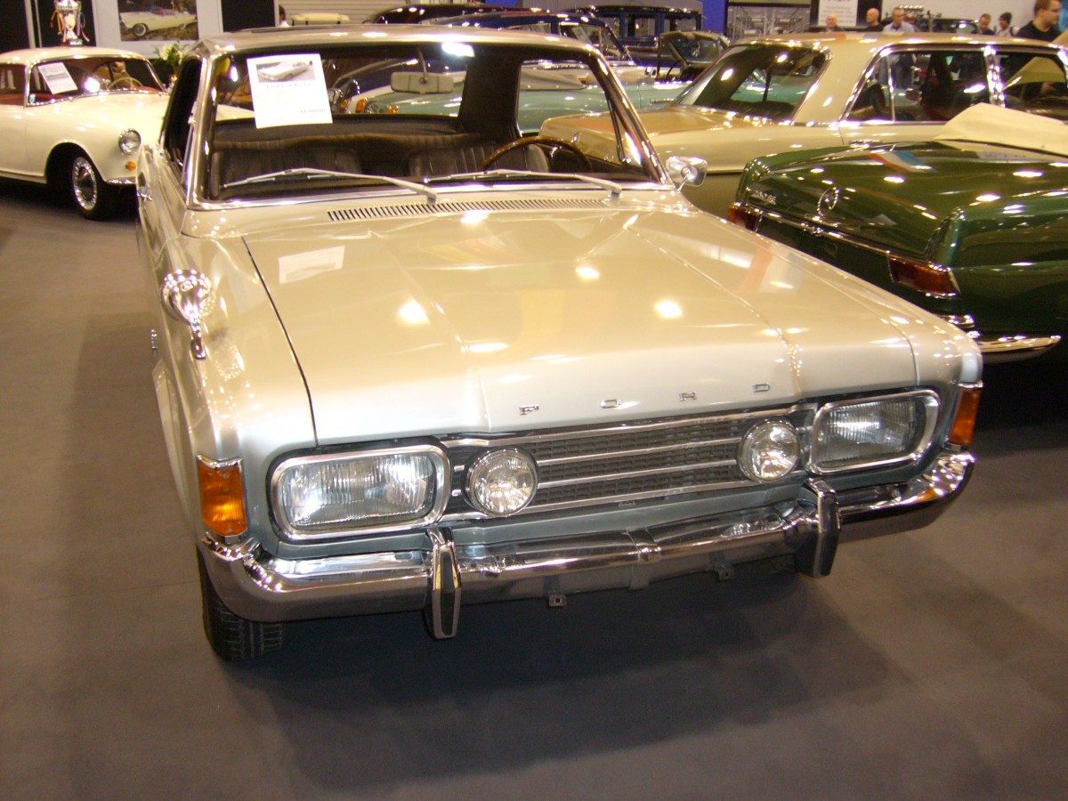 Heckansicht eines Ford P7b Hardtopcoupe in der seltenen RS Ausführung. 1968 - 1971. Der abgelichtet P7b entstammt dem letzten Produktionsjahr. Der V6-motor leistet 90 PS aus 1.998 cm³ Hubraum. Ein solch viersitziges Coupe schlug im letzten Produktionsjahr mit DM 10.565,00 zu Buche. Essen Motorshow am 05.12.2013.