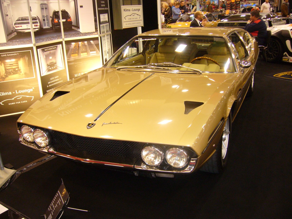 Lamborghini Espada. 1968 - 1978. Hier wurde einer von 1.217 produzierten Espada abgelichtet. Die Karosserie des viersitzigen GT-Sportwagens wurde bei Bertone in Turin hergestellt. Dieser, in oro metallisato lackierte Espada, gehört mit seinem Baujahr 1969 zur ersten Espada Serie. Der V12-motor leistet 325 PS aus 3.929 cm³ Hubraum. Weltweit sollen noch 166 Espada´s existieren. Essen Motorshow am 05.12.2013.