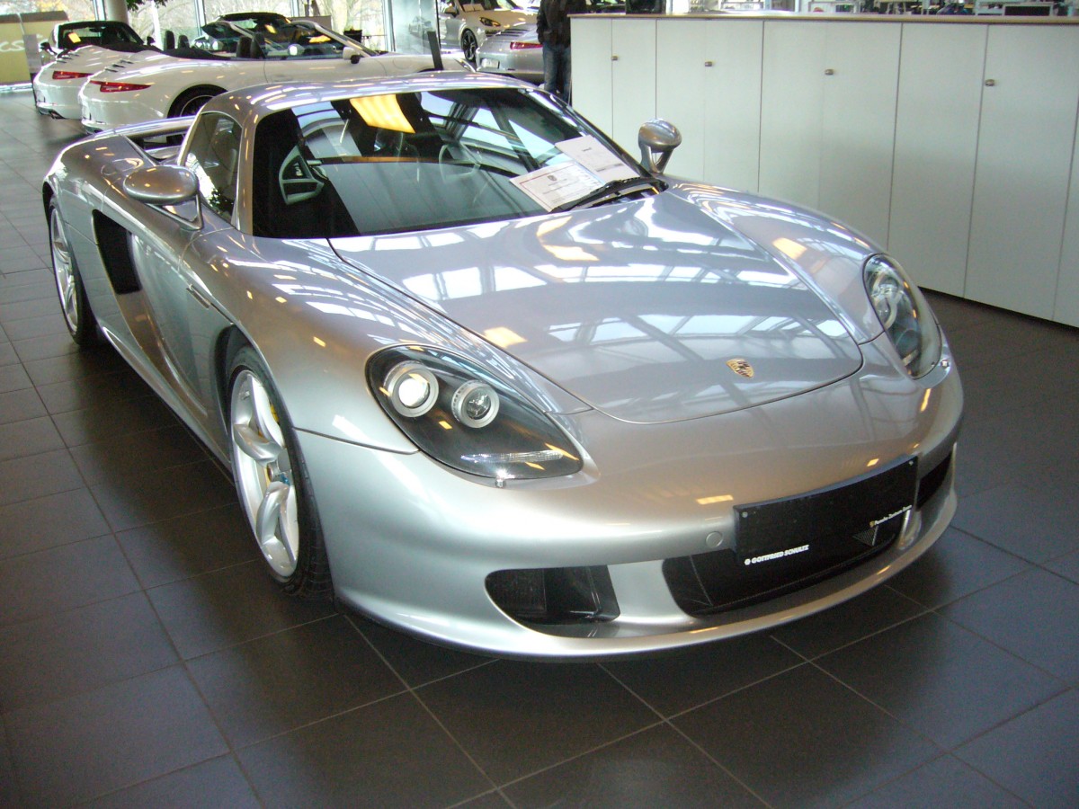 Porsche Carrera GT. 2003 - 2006. Von diesem exclusiven Sportwagen wurden 1.270 Einheiten in Handarbeit produziert. Zusätzlich sollen noch 12 Vorserienfahrzeuge gebaut worden sein. Der V10-motor leistet 612 PS aus 5.733 cm³ Hubraum. Der Neupreis lag bei Ⴌ 452.400,00. Porsche Zentrum Essen am 01.12.2013.