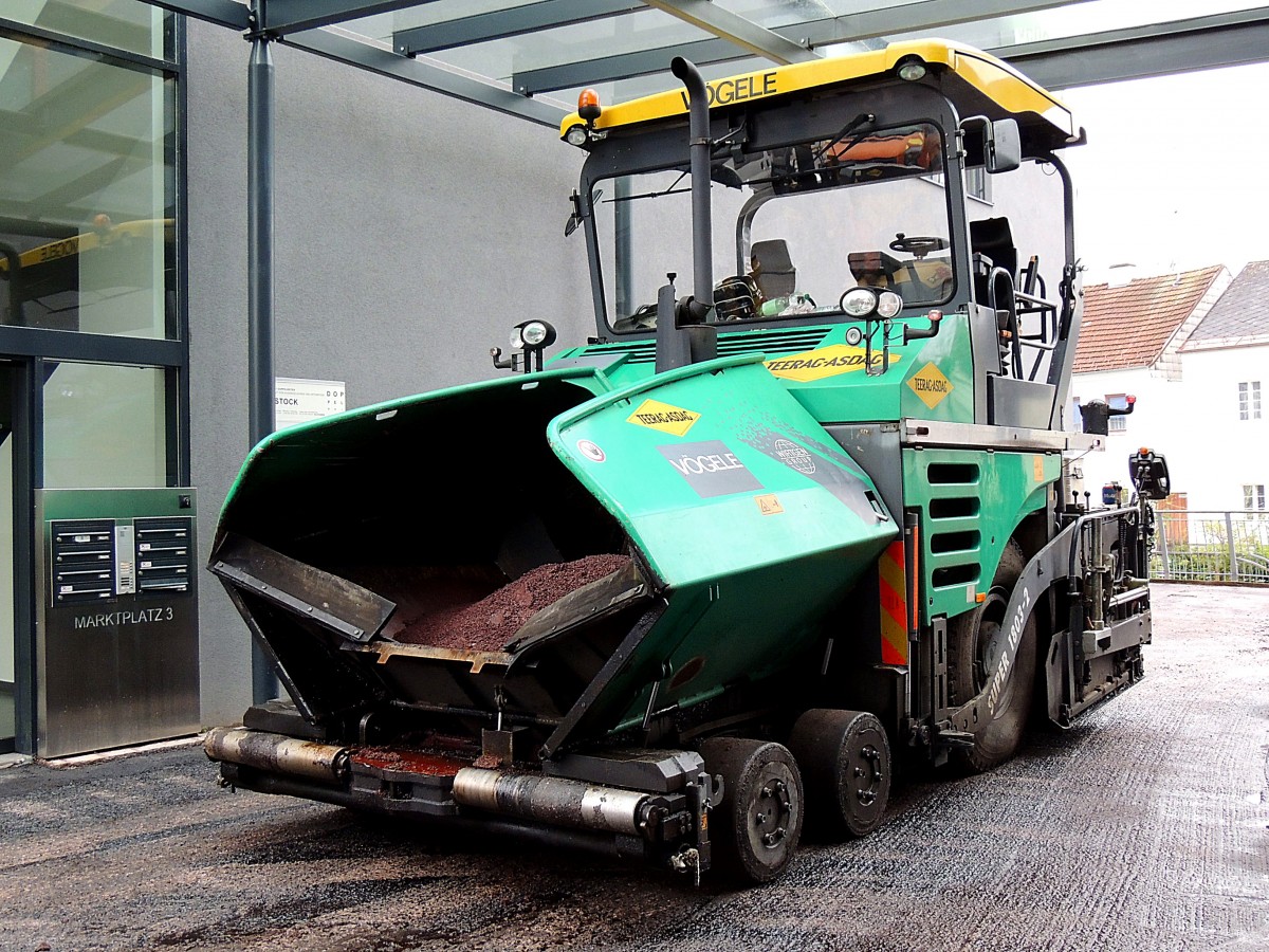 Asphaltfertiger, VÖGELE SUPER1803-2; wartet auf die nächste heisse Lieferung; 120901