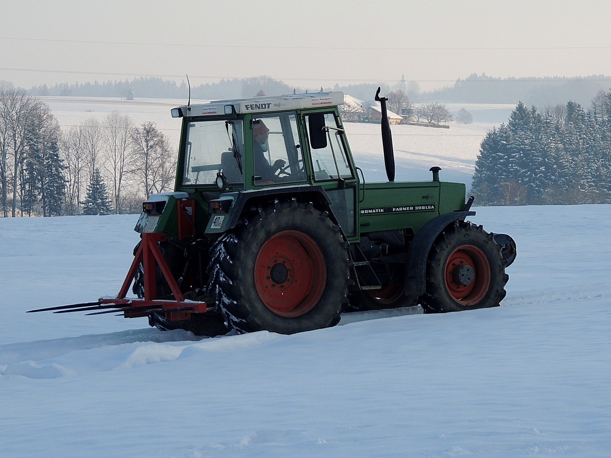 FENDT Farmer308LSA Turbomatic, ist in winterlicher Landschaft am Weg um Siloballen zu holen; 130119