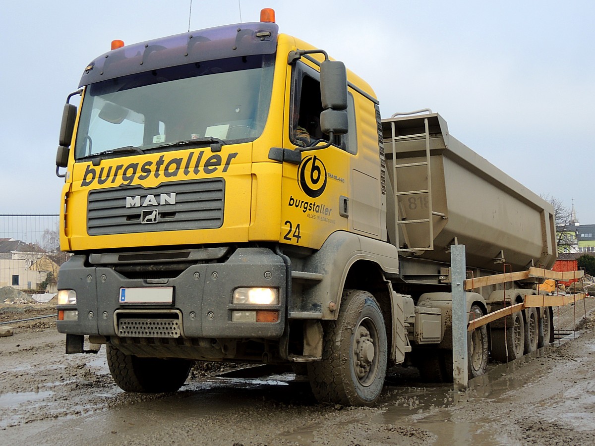 MAN TGA18.440, beladen mit Erdaushub, durchfährt ein Wasserbad um weitgehenst eine Fahrbahnverschmutzung zu vermeiden; 131213