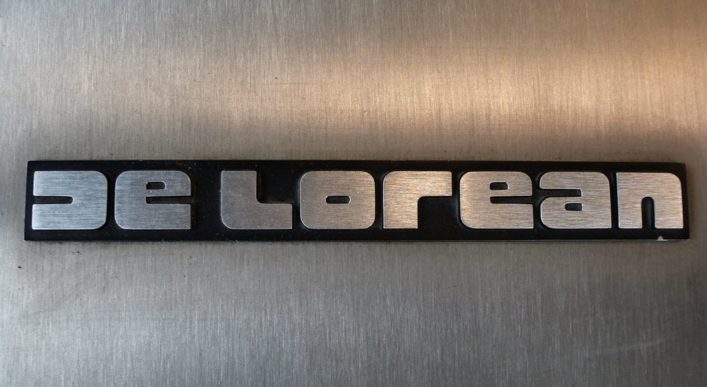 De Lorean DMC-12, Schriftzug auf der Kühlerhaube des Sportwagens, Juni 2013