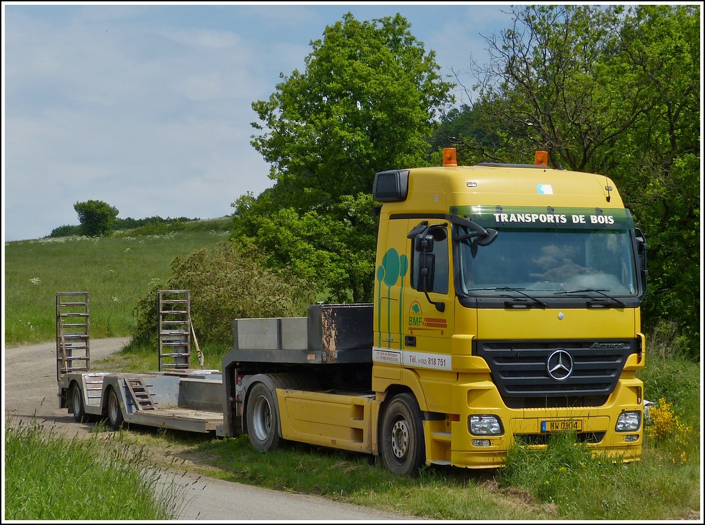 Mercedes Benz Actros mit einem Auflieger für Holzrückmaschinen abgestellt an einem Feldweg. 08.06.2013