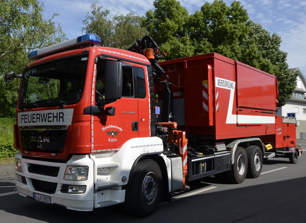 WLF 5-1 der Berufsfeuerwehr Köln, MAN TGS 28.440, Bj. 2012, Funkrufname 05.65.01 beim Absetzen des AB "Versorgung" bei einem Einsatz am 20.06.2013.