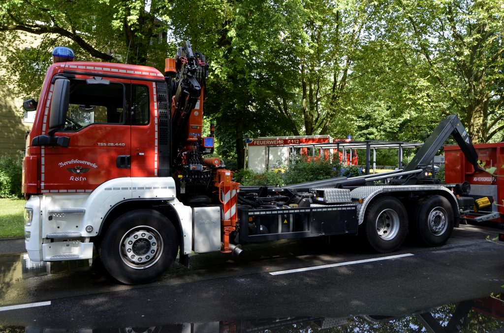 WLF 5-1 der Berufsfeuerwehr Köln mit Atlas Ladekran, K-LN 3857, MAN TGS 28.440, Bj. 2012, Funkrufname 05.65.01, mit ausgefahrenem Hakenlift nach Absetzen des AB "Versorgung" bei einem Einsatz am 20.06.2013.