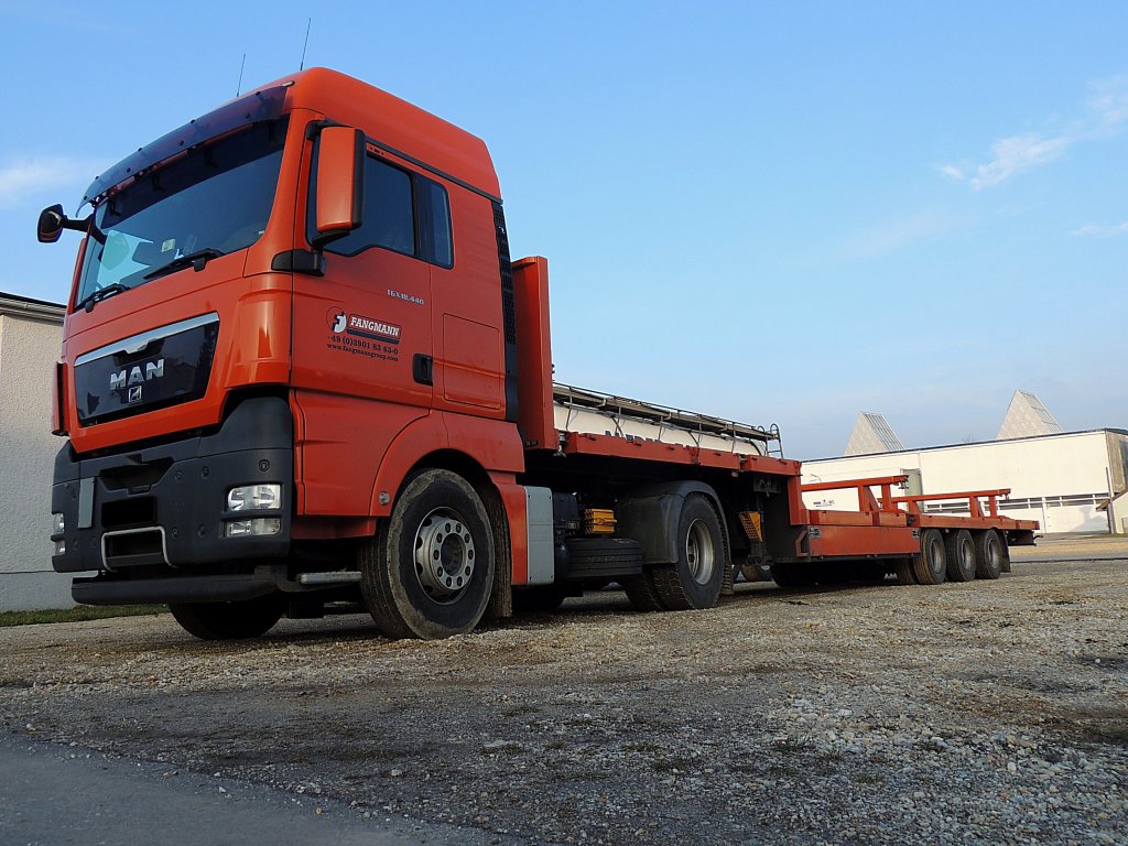 MAN TGX18.440 mit Tiefladesattelauflieger bei einem Zwischenstopp am Rieder Messegelände; 130312