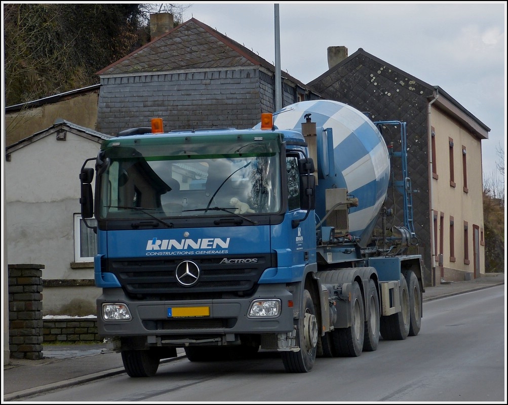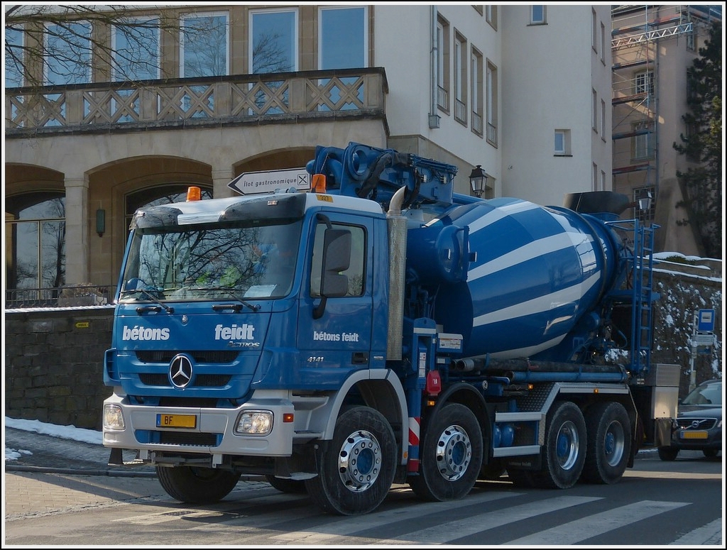 Mercedes Benz Actros 4141 mit Betonmischeraufsatz kurvt durch die engen Straßen der Stadt Luxemburg einer Baustelle entgegen, um seine Ladung abzuliefern. 15.03.2013