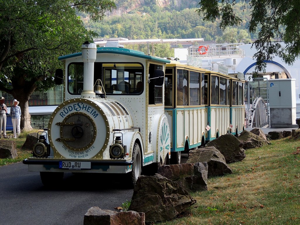 Straßen-Eisenbahn startet in Rüdesheim am Hafen zu einer Stadtrundfahrt; 120829