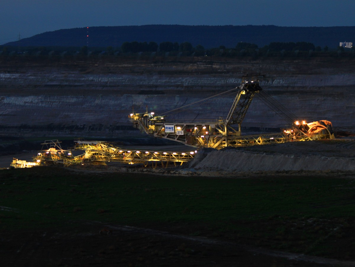 Tag und Nacht graben sich die Schaufelradbagger durch den Tagebau Inden und fressen sich durch die Landschaft um das Kraftwerk in Weisweiler mit Braunkohle zu füttern. Gesehen am Abend des 04.09.2013 vom Aussichtspunkt am Rand des Tagebaus.