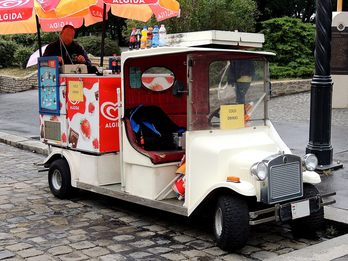 MINI-Umbau wartet im Bereich der Fischbastei zu Budapest trotz Regenwetter mit kühlen Getränken auf; 130826