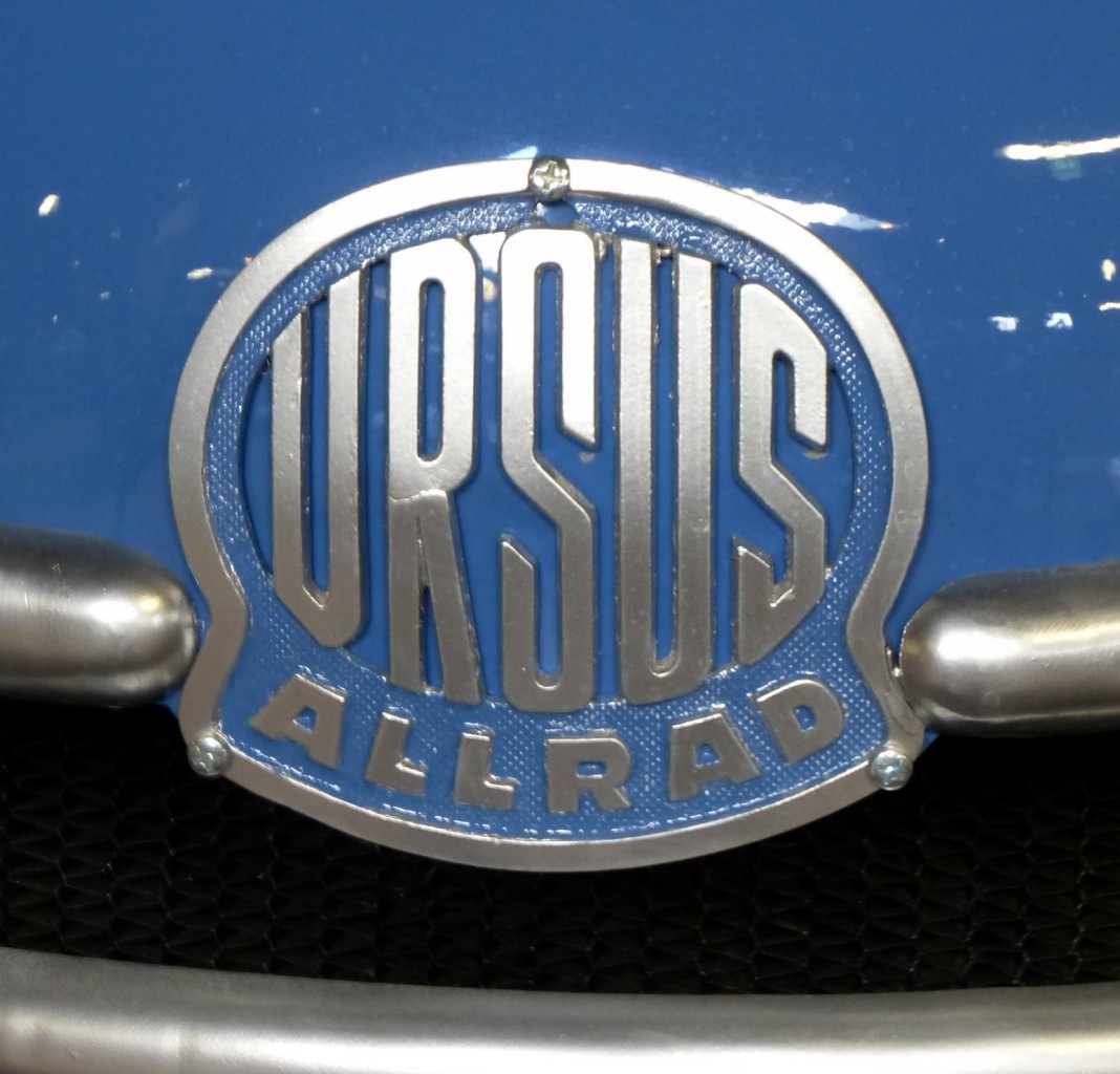 Ursus, Kühleremblem an einem Oldtimer-Traktor der Ursus Traktoren-Werke Erkelenz&Co.in Wiesbaden, hier wurden von 1950-57 Traktoren gebaut, (hat nichts mit der polnischen Traktorenfirma Ursus zu tun), Sept.2013