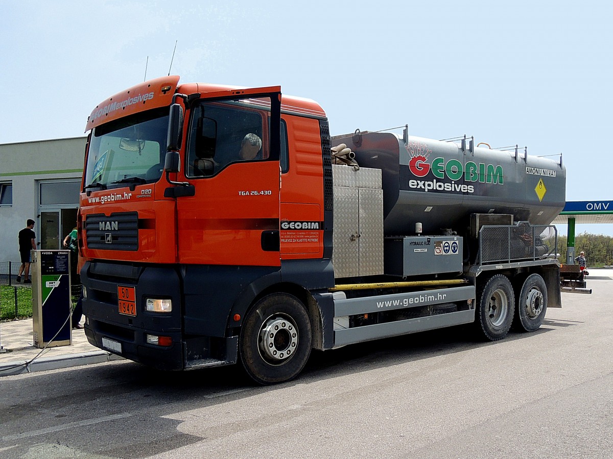 MAN TGA26.430 D20-commonrail, mit Aufbau für Ammoniumnitrat legt auf der Raststätte Ra¨tević einen kurzen Halt ein; 130426