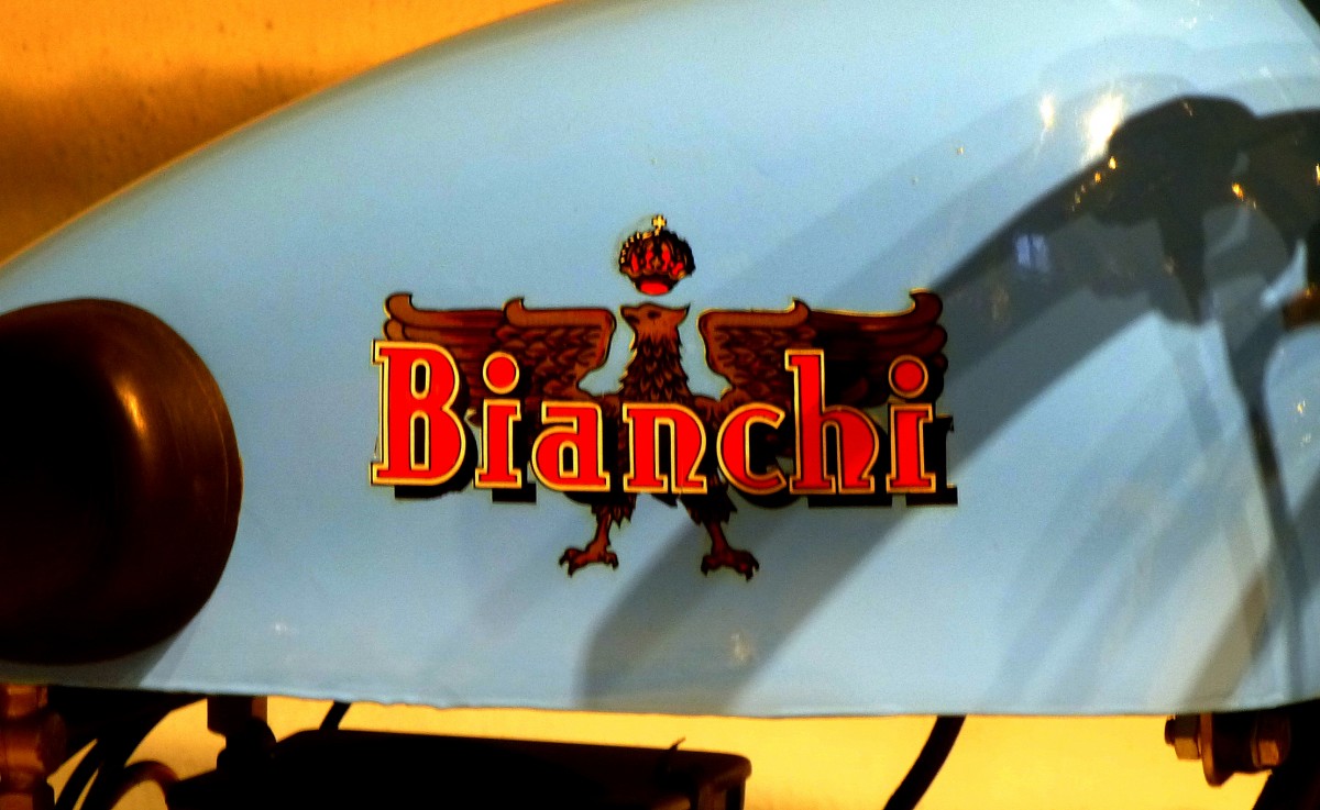 Bianchi, Tankaufschrift am Oldtimer-Motorrad von 1937, 1885 begann die italienische Firma mit der Fahrradproduktion, baute ab 1900 PKW und später Motorräder, Dez.2014