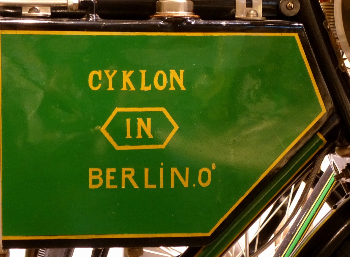 Cyklon-Werke Berlin, Tankaufschrift an einem Oldtimer-Motorrad von 1902, der Motorradbau von Paul Schauer bestand von 1901-05, Dez.2014