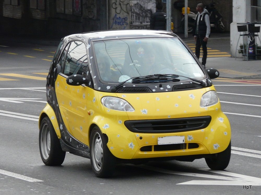 Schwaz- Gelber Smart unterwegs in der Stadt Genf am 11.01.2014
