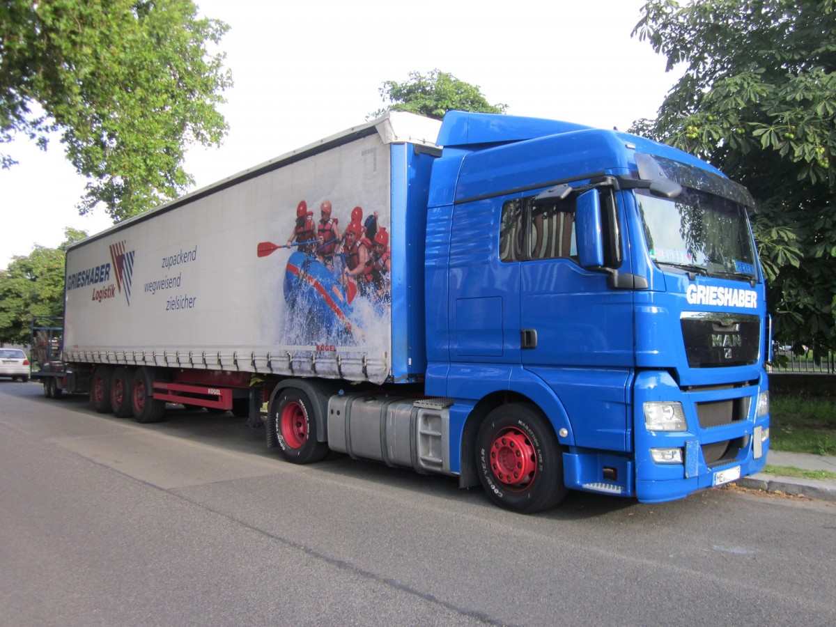 MAN TGX Sattelzug mit "Gardinenplane" im August 2013 in Berlin-Charlottenburg