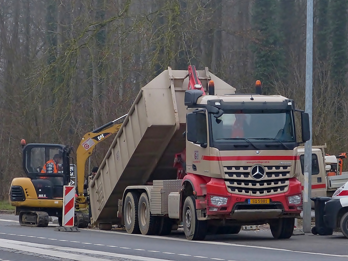 ACTROS-3340, beladen mit Schotter, zieht einen kleinen Tiefladehänger hinter sich her; 130402