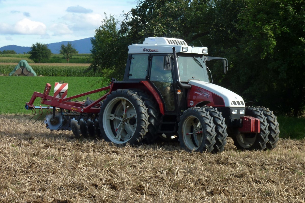 Steyr M-trac 75 spezial, Allradschlepper mit Zwillingsbereifung zur Verminderung des Bodendrucks und angebauter Scheibenegge, Aug.2013