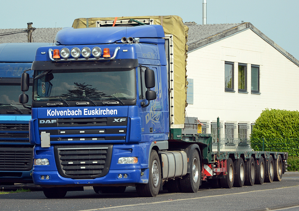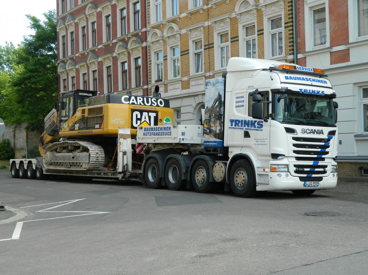 Scania R620 mit Sattel-Tieflader - beladen mit einem CAT 345D Bagger, gesehen am 04.06.2014