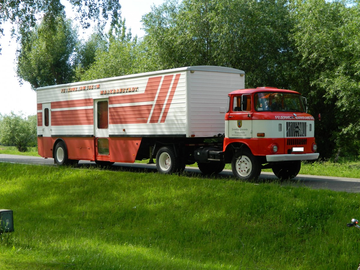 FFw Markranstädt: Der 14 Meter lange W50 Sattelzug, Baujahr 1974, ist als fahrendes Feuerwehrmuseum am 31.05.2014 unterwegs.