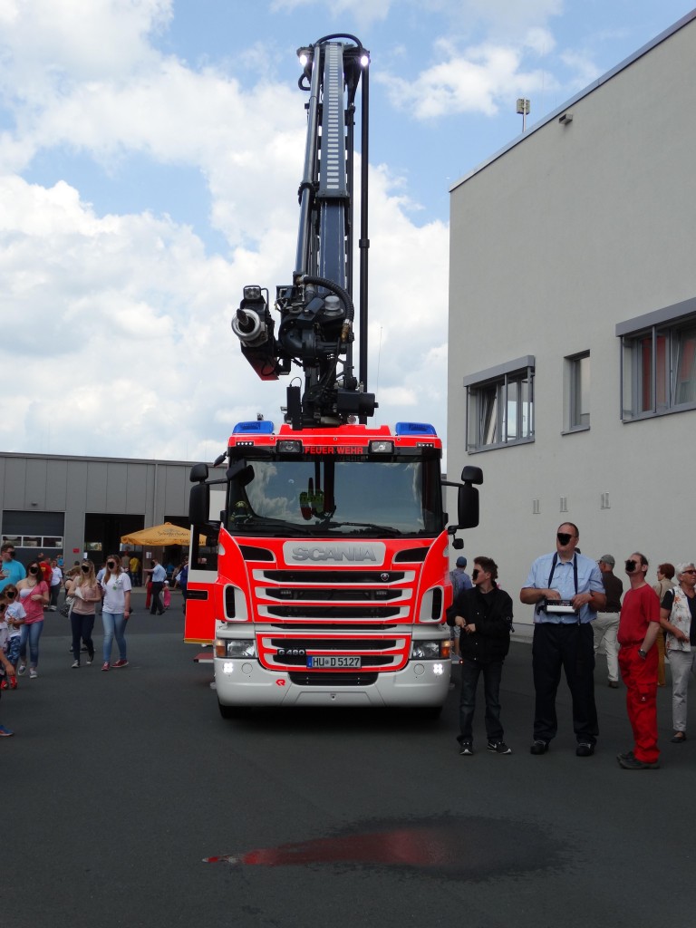 Scania TLF der Werksfeuerwehr Industriepark Hanau Wolfgang am 01.06.14 beim Tag der Offenen Tür der Feuerwehr Hanau Mitte. Dieses Fahrzeug besitzt einen ausfahrbaren Löscharm. Dieser kann per Fernsteuerung bedient werden.