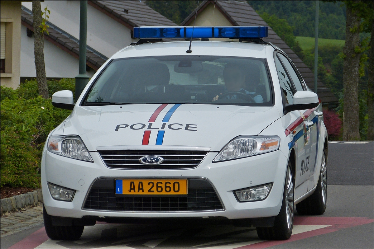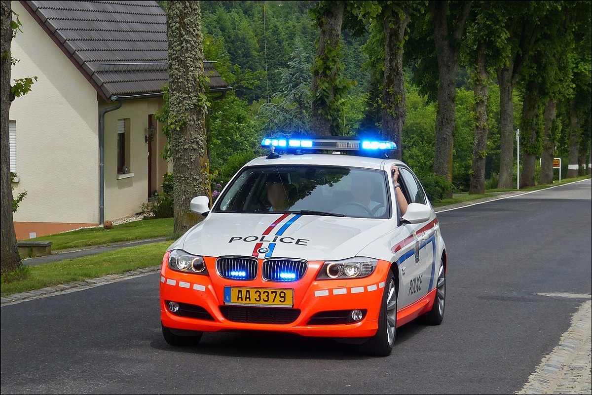 . BMW der Luxemburgischen Polizei mit Blaulicht als Vorhut Fahrzeug eines Radrennens am 07.06.2014.