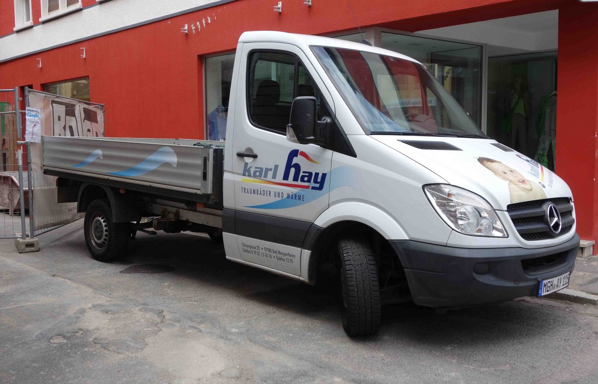 MB Sprinter mit Ladepritsche der Firma "HAY", gesehen in Bad Mergentheim im Juni 2014