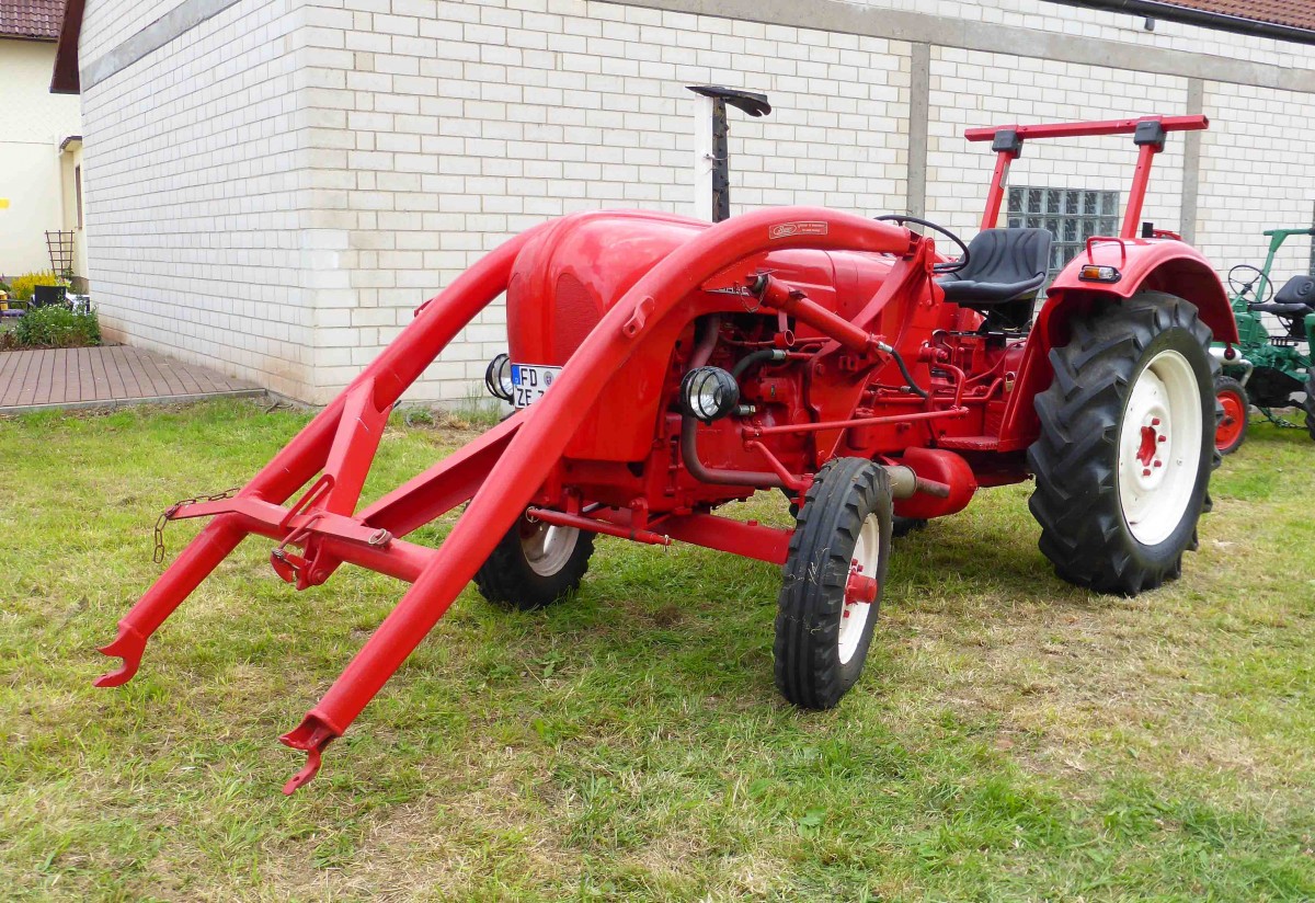 Porsche mit Frontlader, ausgestellt beim Ortsjubiläum von Unterweisenborn im Juni 2014