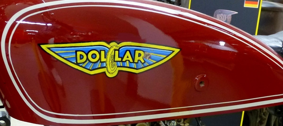 DOLLAR, Tankemblem an einem Oldtimer-Motorrad der französischen Marke, die Firma produzirte von 1925-39, Nov.2014