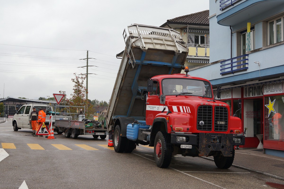 SAURER: Der robuste Zweichachs-Kipper Saurer D 230 steht bei einem Transportunternehmen von Biberist noch oft im Einsatz. Die Aufnahme ist am 14. Oktober 2013 auf einer Baustelle in Biberist entstanden.