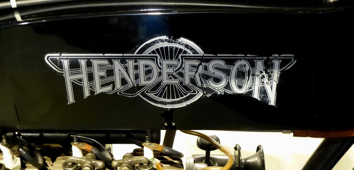 Henderson, Tankaufschrift an einem Oldtimer-Motorrad Model E von 1910, die US-amerikanische Firma war bekannt für ihre Reihenvierzylindermaschinen, bestand bis 1931, Nov.2014