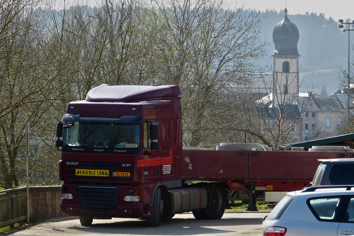 . Dieser Fahrer des DAF XF mit langem Auflieger, hat seine Mühe um die zugeparkte Engstelle zu umfahren. 09.04.2015