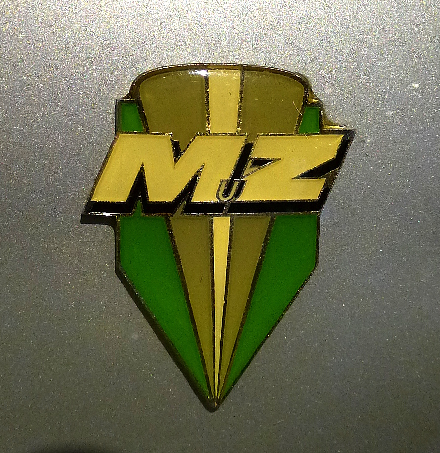 MuZ, Tankemblem an einem Motorrad der Motorradwerke Zschopau/Sachsen, neben MZ wurde auch kurzzeitig das Kürzel MuZ verwendet, April 2015
