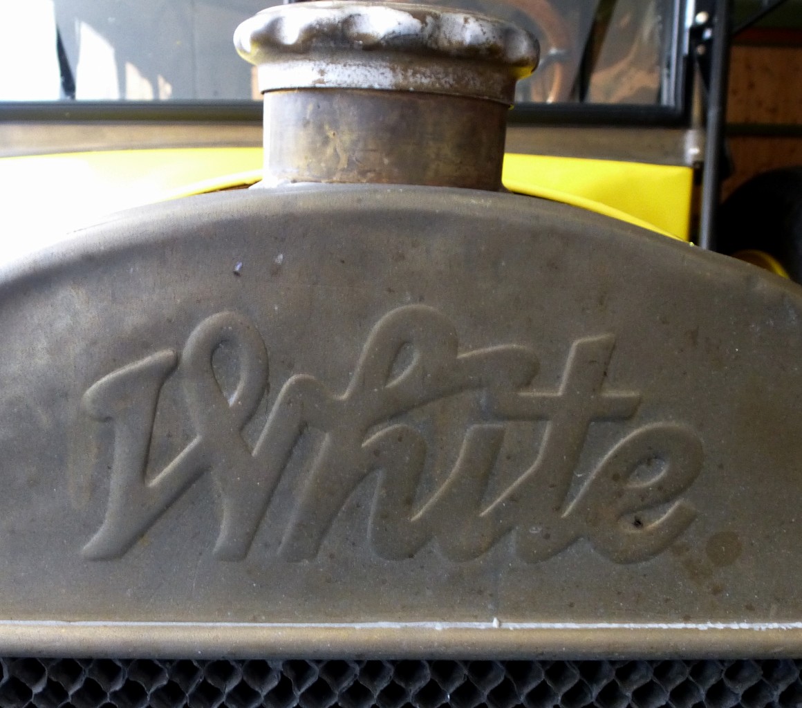 White Motor Company, Schriftzug am Kühler eines Oldtimer-Busses von 1925 der US-amerikanischen Fahrzeugbaufirma, Aug.2015